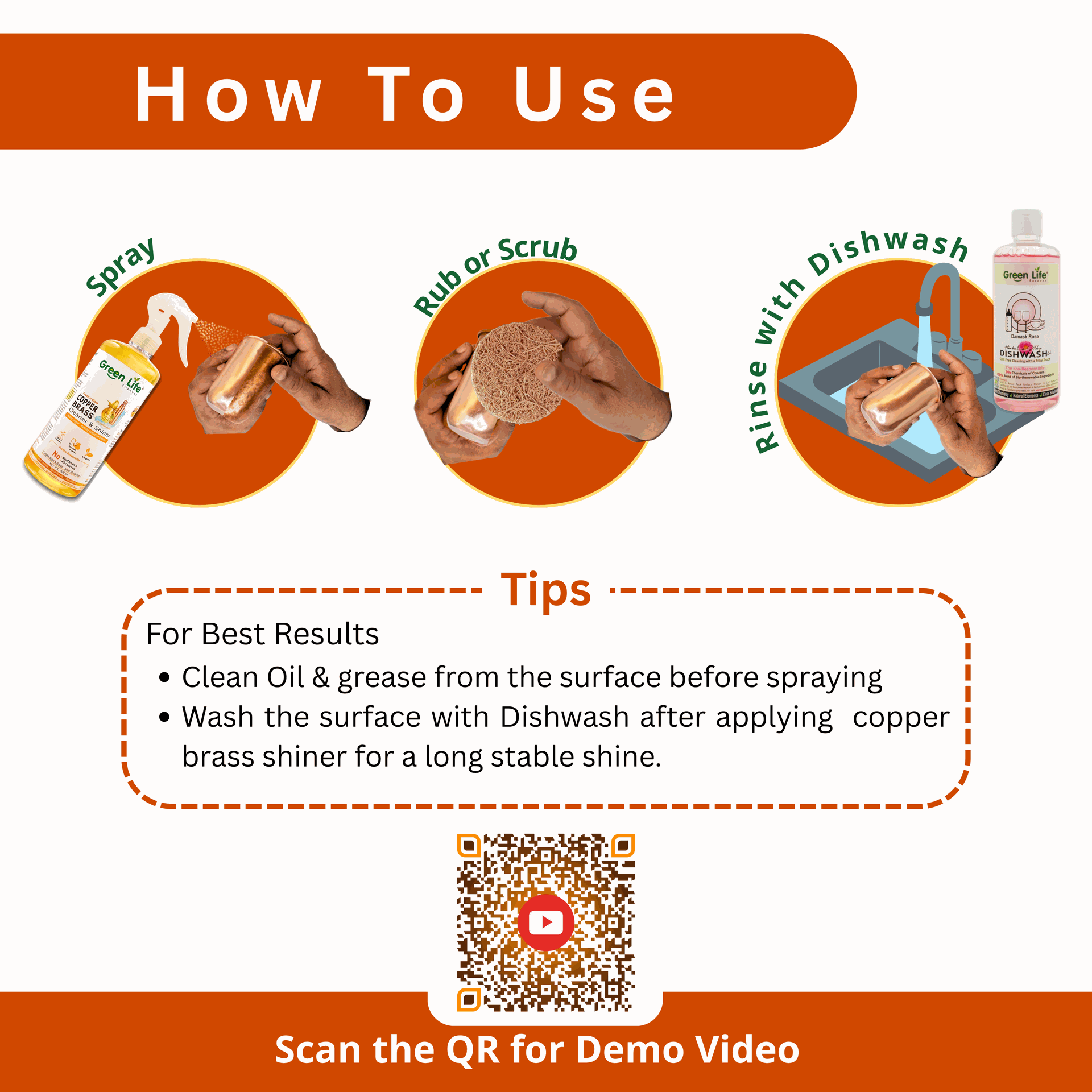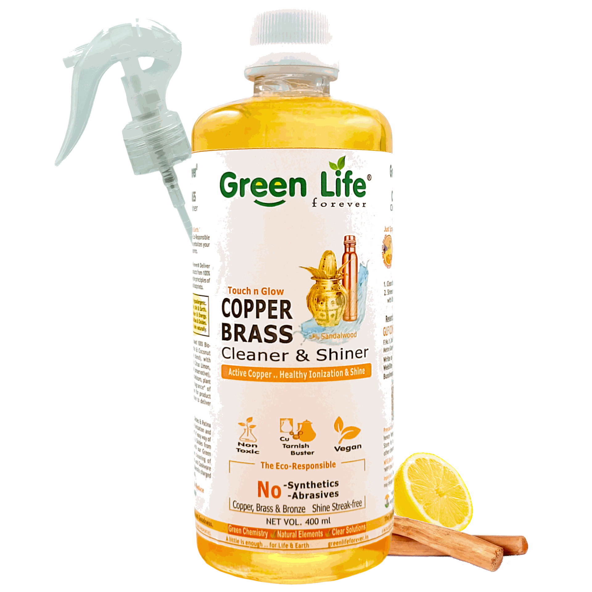 Green Life Forever Copper Bronze & Brass Cleaner and Shiner provides an instant Touch n Glow effect that clean and restore the shine of your copper, brass, bronze, kansa, and phool metal items—naturally.